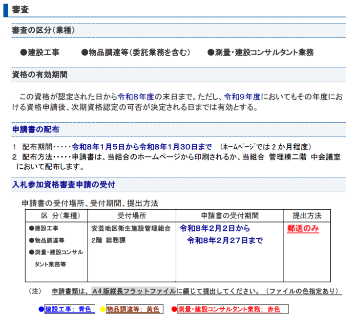令和7年度及び令和8年度において、安芸地区衛生施設管理組合が発注する建設工事、測量・建設コンサルタント業務及び物品調達等の指名競争入札に参加する資格を認定するため、次のとおり申請等の受付を行います。